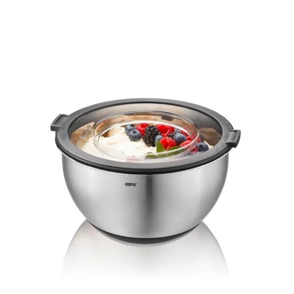 Mit dem praktischen Schüssel-Set Muovo von Gefu wird das Rühren, Anrichten und Transportieren zu einer sauberen Sache, denn die zugehörigen Spritzschutzdeckel gewähren nicht nur einen Blick auf den Inhalt, sondern schützen auch vor Teigspritzern oder dem Auslaufen von Dressing.